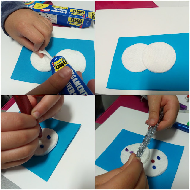 Lehenengo honetan, elur panpina elegante bat egin degu. Horretarako kotoizko bi disko hartu eta gure kartulinan pegatuko ditugu kolarekin lagunduta.